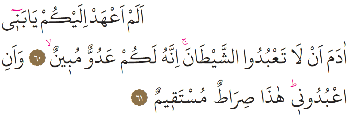 “ELEM AHAD İLEYKÜM YA BENİ ADEME EN LA TABİ ÜDÜŞ ŞEYTAN ; İNNEHU LEKÜM ADÜVVÜN MÜBİN - VE ENİ’ BÜDUNİ HEZA SIRATÜN MÜSTEKİM.”