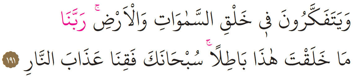 “GÖKLERİN ve ARZIN İÇİNDEKİLERİN YARADILIŞINI DÜŞÜNÜRLER. Rabbimiz, Sen, gereksiz noksan bir şey yaratmadın. (Noksandan münezzeh, kemalatla muttasıf olmakla) seni tesbih ederiz. Bizi cehennem azabından koru.”