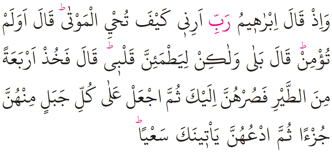 “VE İZKALE İBRAHİMÜ RABBİ ERİNİ KEYFE TUHYİL MEVTA. KALE EVELEM TÜMİN KALE BELA VELAKİN LİYATMEİNNE KALBİ. KALEFEHUZ ERBAATEN MİNETTAYRİ FESURHÜNNE İLEYKE SÜMMEC AL ALA KÜLLİ CEBELİN MİNHÜNNE CÜZEN SÜMMED UHÜNNE YETİNEKE SAYE”