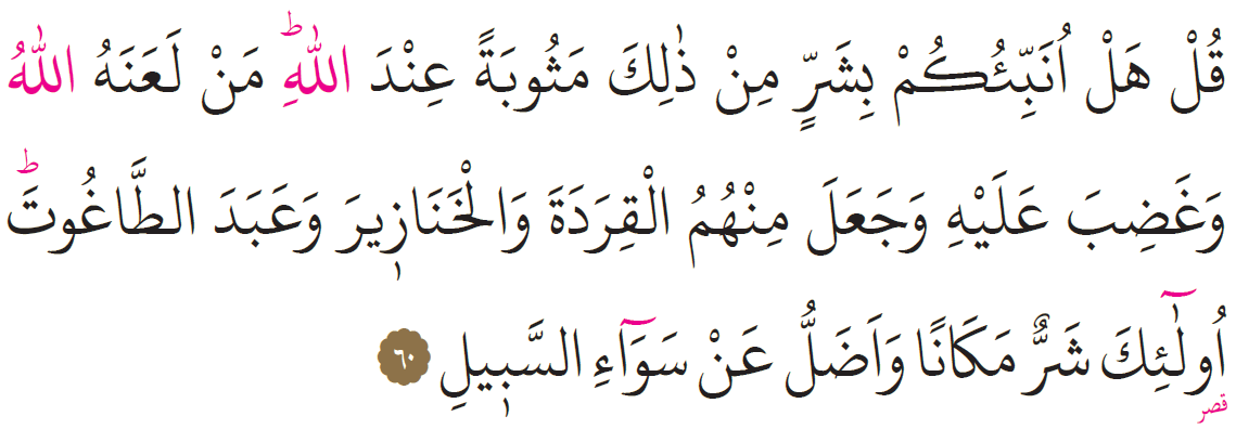 “Deki; Allah katında yeri bundan daha kötü olanı size haber vereyimmi? Allah’ın lanetlediği ve gadap ettiği, aralarında maymunlar, domuzlar ve tağutlara tapanlar çıkardığı kimseler, işte bunlar yeri daha kötü olan ve doğru yoldan daha ziyade sapmış bulunanlardır.”