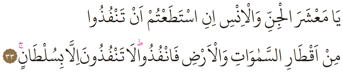 “Ey insan ve cin toplulukları; semaların ve yerin her tarafından çıkıp gitmeye gücünüz yetiyorsa geçin gidin... Geçemez, gidemezsiniz, ancak Allah’ın kudretiyle gidebilirsiniz”