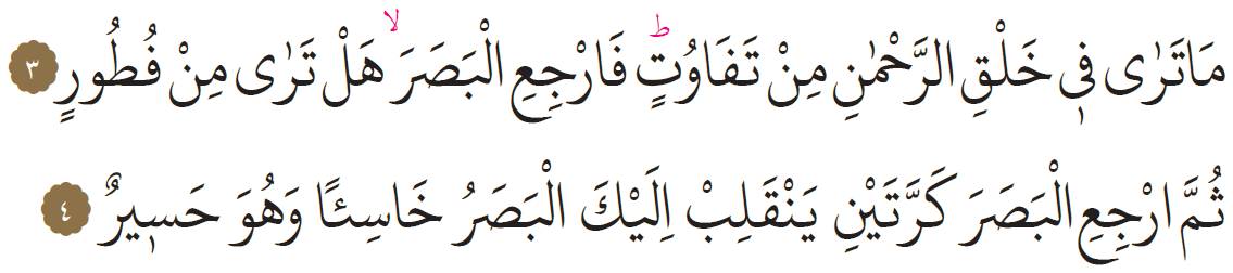 “MA TERA Fİ HALKIRRAHMANİ MİN TEFAVÜT. FERCİİL BASARA HEL TERA MİN FÜTUR. SÜMMERCİİL BASARA KERRATEYNİ YENKALİB İLEYKEL BASARU HASİEN VE HUVE HASİR.”